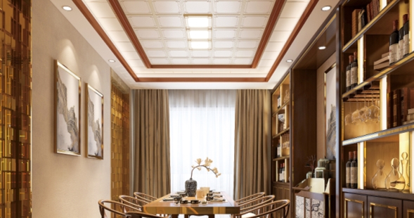 現(xiàn)代感十足的吊頂設(shè)計、扣板上簡潔的圖案,更是給人以視覺上的完美享受。這種極簡風(fēng)格的餐廳設(shè)計更適合快節(jié)奏的生活。