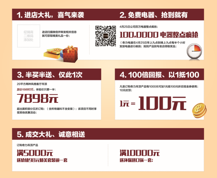 凡是訂購奇力吊頂產(chǎn)品每1000元可加1元抵100元折后現(xiàn)金券使用,10元封頂