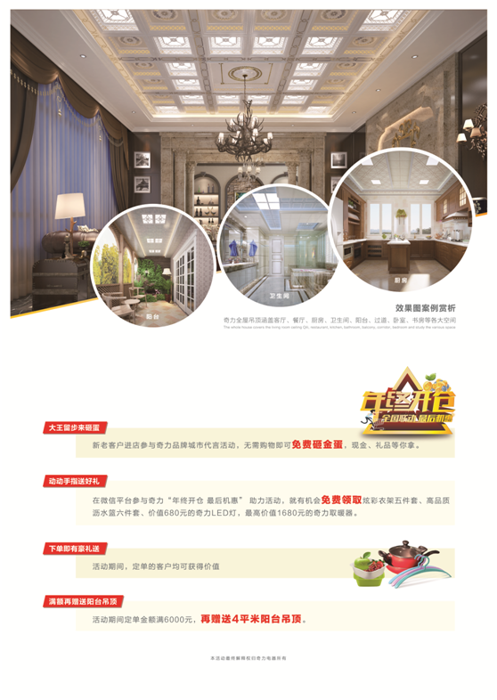 本次活動內(nèi)容豐富,新老客戶進(jìn)店參與奇力品牌城市代言活動,無需購物即可免費砸金蛋,現(xiàn)金、禮品等你拿?;顒悠陂g,定單的客戶均可獲得精美禮品一份,驚喜不斷,活動連連,更多的內(nèi)容煩請進(jìn)店咨詢,走過路過奇力吊頂專賣店,一定不要錯過。