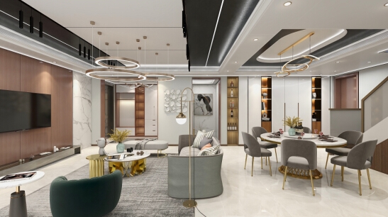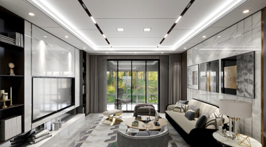 在這個(gè)客廳里,頂墻地以黑白灰來(lái)配色,定調(diào)整體統(tǒng)一性,在視覺上達(dá)到相對(duì)的“一致性”,這樣的空間真的高級(jí)感十足。
